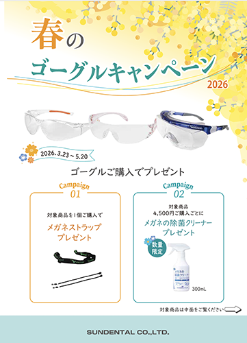 キャンペーン・展示会情報,サンデンタル株式会社,歯科医院専用,歯科医師,歯科衛生士,歯科技工士,製品販売,むし歯,虫歯,歯周病予防,プラーク除去,カリエス予防,口腔ケア,歯垢除去,知覚過敏,オーラルケア,歯ブラシ,インスツルメント,技工機器日頃のご愛顧に感謝の気持ちを込めて、「春のゴーグルキャンペーン2026」を実施致します。